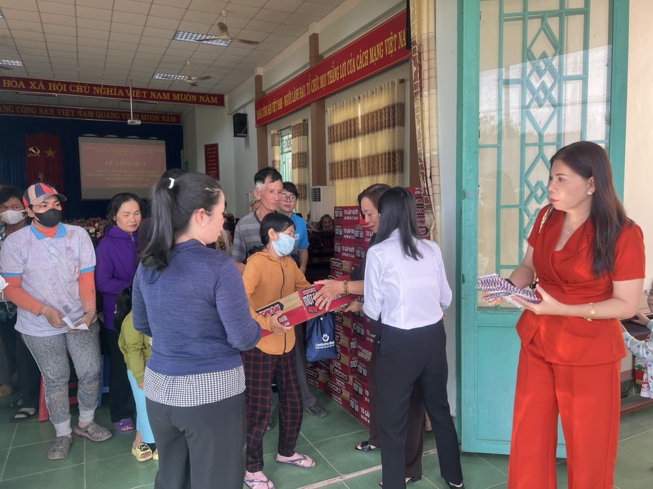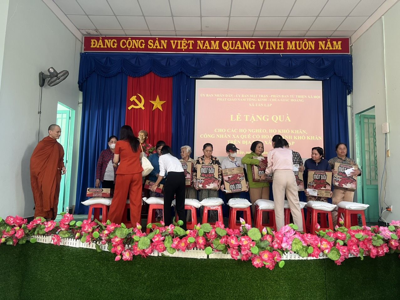 Đến dự buổi trao quà về phía lãnh đạo địa phương có Bà Trần Thị Thuỳ Dung – PCT. HĐND xã; Bà Lê Thị Kim Anh CT. UBMTTQVN xã; Bà Trần Thị Thanh Hương – Phó Chủ tịch UBND xã, về phía Chùa Gíac Hoàng có Đại Đức Thích Minh Tấn – Trụ trì chùa Giác Hoàng, về phía mạnh thường quân có Bà Nguyễn Thanh Nhã Uyên cùng các đoàn thể xã đại diện các hộ gia đình có hoàn cảnh khó khăn và bà con nhân dân trên địa bàn xã Tân Lập.