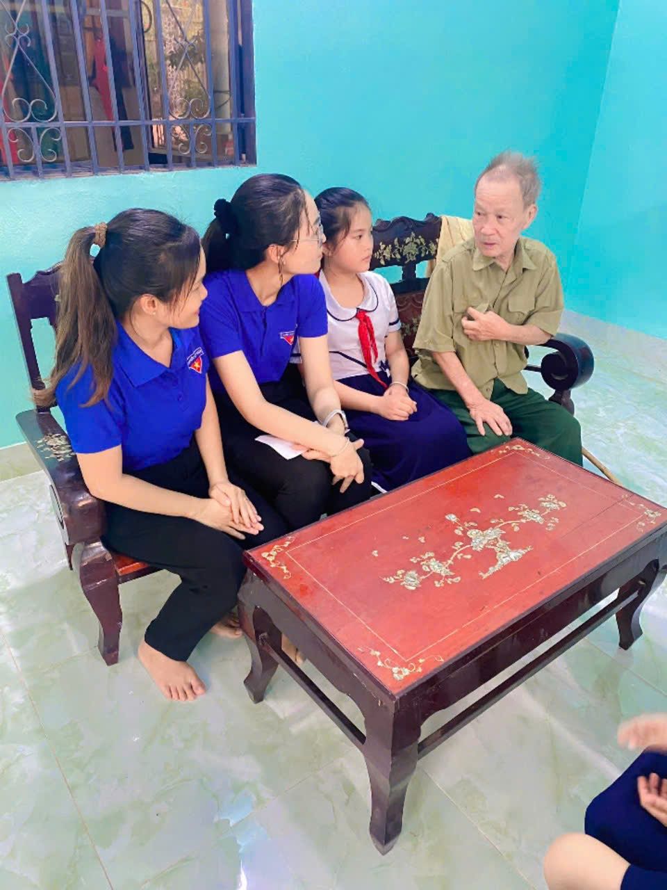 Đến với gia đình, các em đội viên đã hỏi thăm sức khỏe, chúc Ông luôn mạnh khỏe, luôn là chỗ dựa tinh thần vững chắc cho con cháu. Ông rất vui vì có các cháu đến thăm hỏi, Ông tâm sự về những vất vả của các thế hệ đi trước trong kháng chiến và ý chí nghị lực vượt qua khó khăn gian khổ để mang lại tự do hạnh phúc ấm no như ngày hôm nay. Ông dặn các cháu phải ghi nhớ công ơn này và hãy cố gắng học tập để xây dựng quê hương đất nước. Các em đội viên cảm ơn Ông đã tâm sự sẻ chia để các em hiểu thêm được những vất vả gian truân mà các thế hệ cha ông đã trải qua. Đồng thời, các em hứa với Ông sẽ cố gắng, nỗ lực trong học tập, rèn luyện tốt để luôn xứng đáng là con ngoan, trò giỏi, đội viên tốt, cháu ngoan Bác Hồ, là chủ nhân của đất nước trong tương lai.