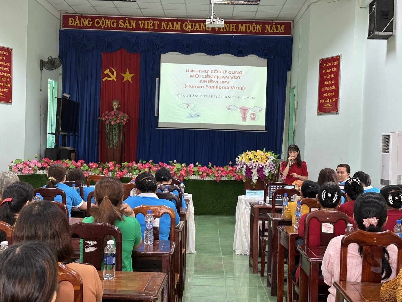 Tại buổi hội nghị các chị em được nghe bác sĩ Ngô Thị Thu Hiền cử nhân chuyên khoa sản TTYT huyện bắc Tân Uyên tuyên truyền những nội dung liên quan đến sức khỏe sinh sản, và sức khỏe tiền hôn nhân.