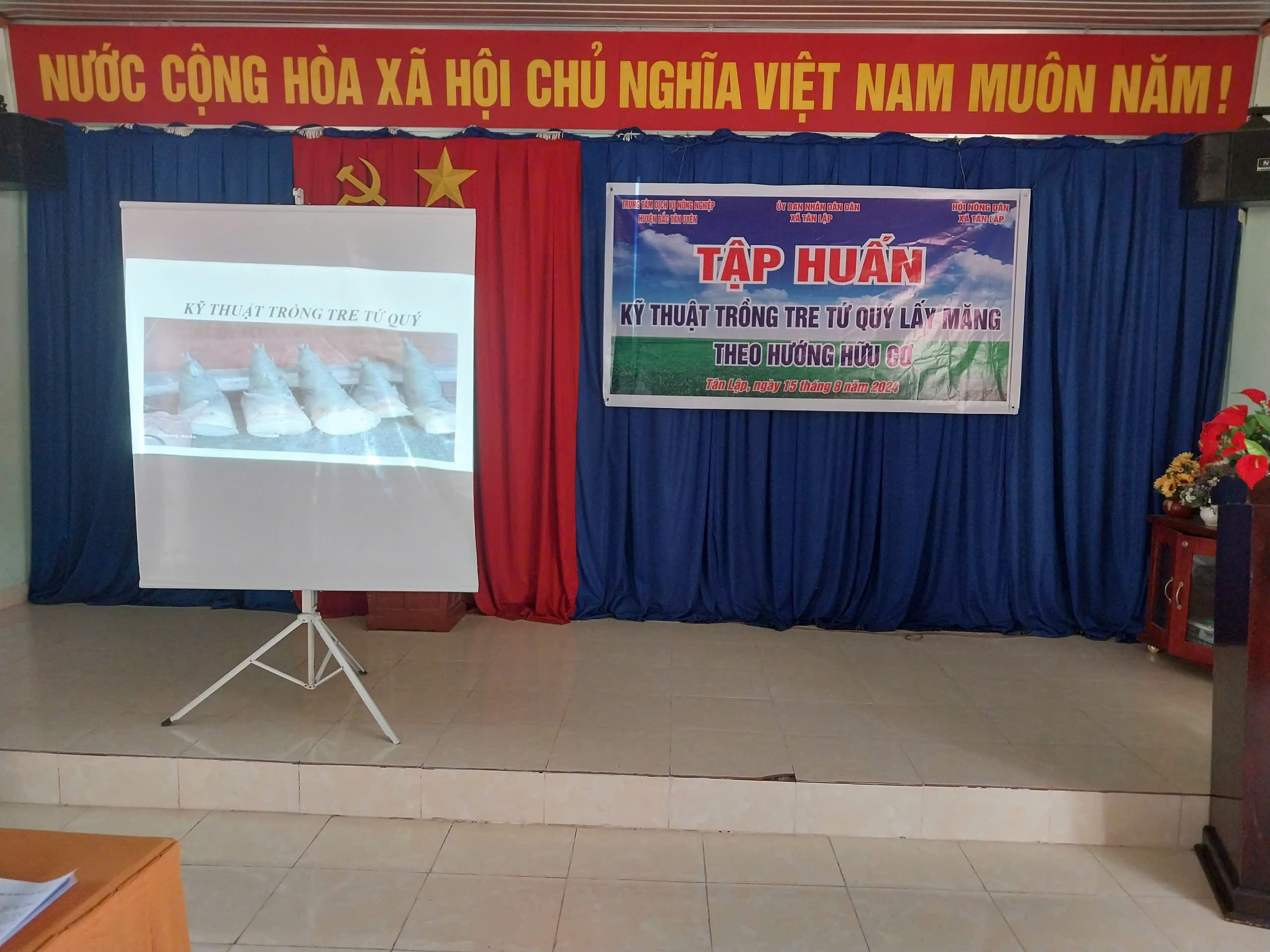 Được sự cho phép của đảng ủy – UBND xã hôm nay ngày 15/8/2024, Hội Nông dân xã Tân Lập phối hợp với UBND xã và Trung tâm Dịch vụ Nông nghiệp huyện Bắc Tân Uyên tổ chức lớp tập huấn chuyển giao khoa học kỹ thuật với nội dung "Kỹ thuật trồng tre tứ quý lấy măng theo hướng hữu cơ" đến cán bộ, hội viên và nhân dân trên địa bàn xã vào lúc 13giờ 30 phút ngày 15 tháng 8 năm 2024 tại Văn phòng ấp 3.