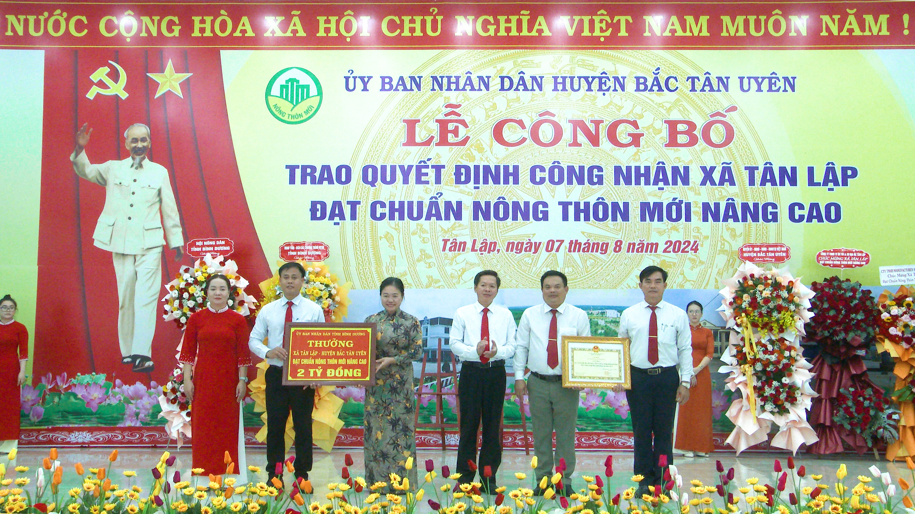 Chiều ngày 7-8, Uỷ ban nhân dân huyện Bắc Tân Uyên long trọng tổ chức lễ công bố và đón nhận Quyết định của Chủ tịch UBND tỉnh Bình Dương, công nhận xã Tân Lập đạt chuẩn nông thôn mới (NTM) nâng cao năm 2023. Tham dự lễ có ông Hồ Trúc Thanh- Phó giám đốc sở nông nghiệp và phát triển nông thôn tỉnh; bà Trần Thị Kim Lan- Phó Chủ tịch UB MTTQ VN tỉnh cùng lãnh đạo các ban, ngành của tỉnh. Về Phía Huyện có ông Thái Thanh Bình- TUV, Bí thư Huyện ủy; ông Võ Văn Tính- Phó Bí thư Thường trực Huyện ủy, Chủ tịch HĐND huyện; ông Nguyễn Thành Thường- Phó Bí thư Huyện ủy, Chủ tịch UBND huyện cùng các Ủy viên ban Thường vụ Huyện ủy; lãnh đạo các ban, ngành, đoàn thể huyện, lãnh đạo các xã, thị trấn; lãnh đạo UBND xã và Ban điều hành, ban công tác mặt trận, các doanh nghiệp, hợp tác xã trên địa bàn xã Tân Lập.