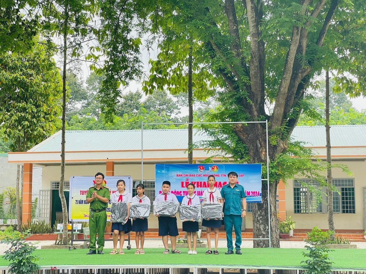 Tại buổi lễ đã trao tặng 24 phần học bổng của tỉnh, huyện cho 24 em thiếu nhi có hoàn cảnh khó khăn trên địa bàn. Qua đó nhằm thực hiện tốt công trình “Vì đàn em” chăm lo cho các em học sinh có hoàn cảnh khó khăn, BCĐ hè đã nhận được sự ủng hộ từ gia đình Cô Đỗ Thị Thanh Thúy CT.Hội NCT xã, chị Ngô Thị Tuyết Đẹp-Đội viên đội cơ động xử lý sự cố giao thông huyện và anh Lê Minh Châu CC.DC-XD xã đã trao tặng 25 phần quà cho 25 em học sinh có hoàn cảnh khó khăn gồm (200 quyển tập trắng, 50 bút mực, 150 bút chì, 30 gôm tẩy và 6 cặp học sinh) với tổng trị giá 3.850.000 đồng