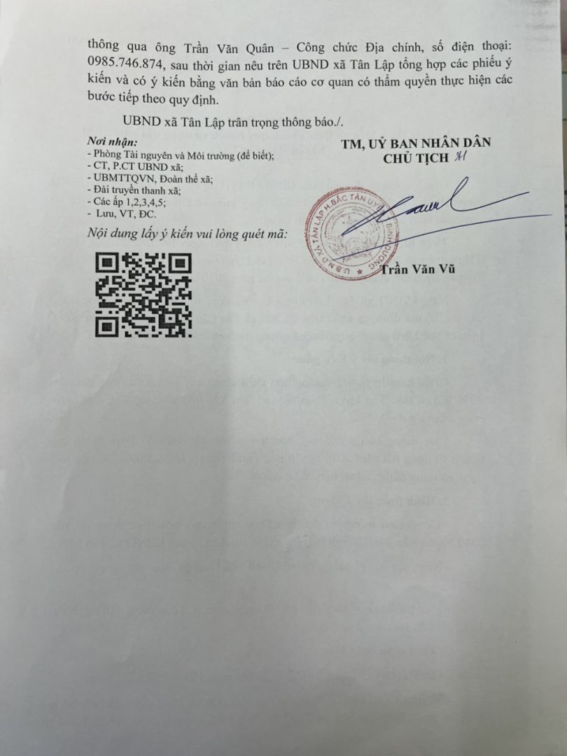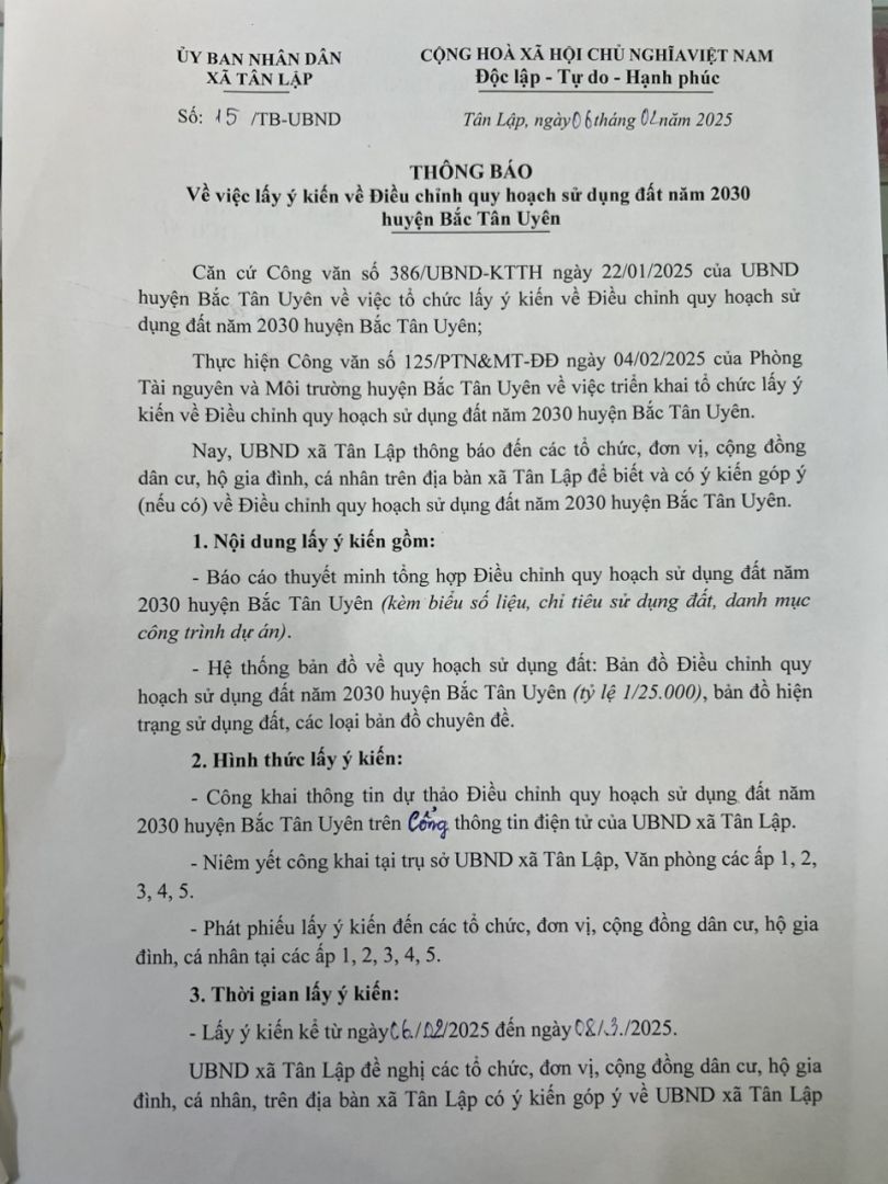 Thông báo về việc lấy ý kiến về điều chỉnh quy hoạch sử dụng đất năm 2030 huyện Bắc Tân Uyên