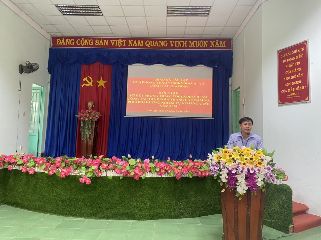Chiều ngày 18/7/2024 tại hội trường UBND xã Tân Lập tổ chức Hội nghị sơ kết thực hiện phong trào “TDĐKXDĐSVH” và công tác gia đình 6 tháng đầu năm 2024, Triển khai phương hướng nhiệm vụ 6 tháng cuối năm 2024. Về tham dự hội nghị có ông Lê Thanh Lưu - HUV/ Bí thư Đảng uỷ xã; Ông Phạm Đỗ Trí – Phó bí thư Đảng uỷ/ CT. HĐND xã; Ông Trần Văn Vũ – Phó bí thư Đảng uỷ/ CT. UBND xã; Bà Trần Thị Thuỳ Dung – Đảng uỷ viên/ PCT. HĐND xã và toàn thể CBCC, các ban ngành, đoàn thể và BĐH 5 ấp cùng về tham dự.