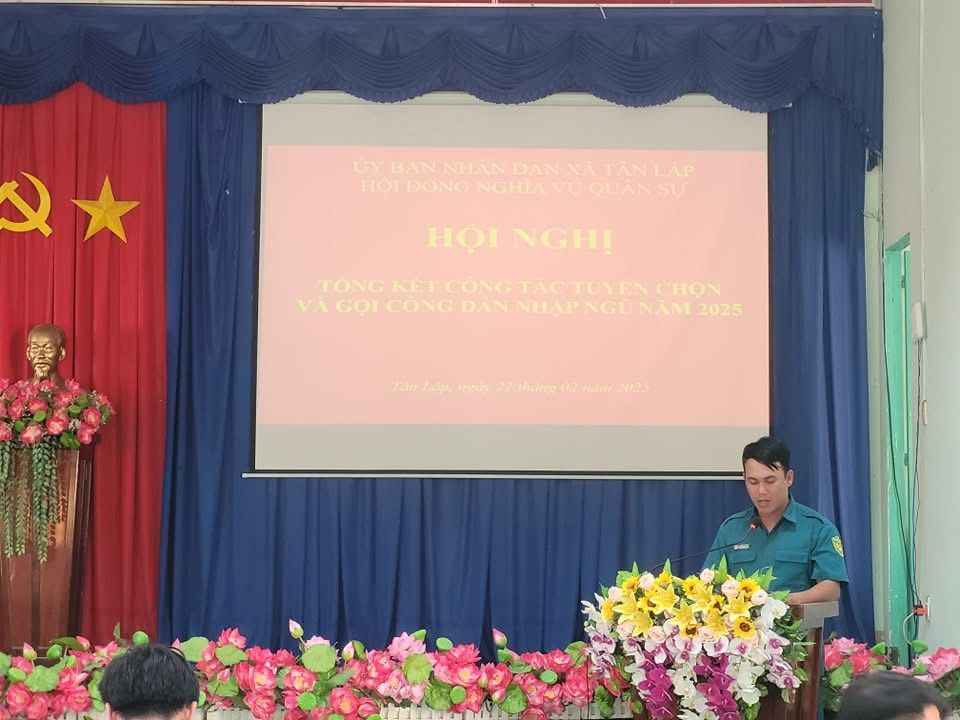 Chiều ngày 27/02/2025 Hội đồng NVQS xã Tân Lập, huyện Bắc Tân Uyên, tỉnh Bình Dương đã tổ chức thành công Hội nghị tổng kết công tác tuyển chọn, gọi công dân nhập ngũ năm 2025. Đến dự Hội nghị có Đ/c Nguyễn Đức Hiếu - Đại diện Ban CHQS huyện; Đ/c Lê Thanh Lưu - Bí thư Đảng uỷ xã; Đ/c Phạm Đỗ Trí - Phó BT Đảng ủy - CT. HĐND xã; Đ/c Trần Văn Vũ - Phó Bí thư Đảng uỷ - CT. UBND - CT. HĐNVQS xã chủ trì hội nghị cùng toàn thể các đ/c đại diện Ban, ngành, đoàn thể xã là thành viên Hội đồng NVQS xã và đặc biệt có sự hiện diện của 11 gia đình công dân lên đường nhập ngũ năm 2025.